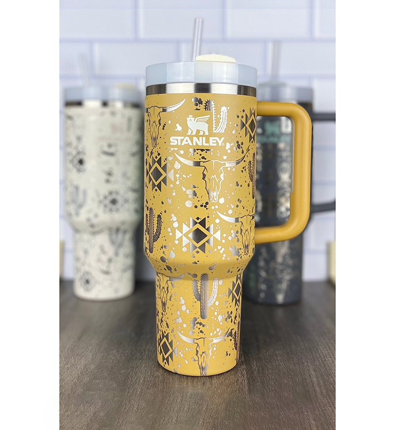 40oz Stanley Cup with a western 360 wrap design. The one in the image is laser engraved on a Rose Quartz Glow Quencher.
